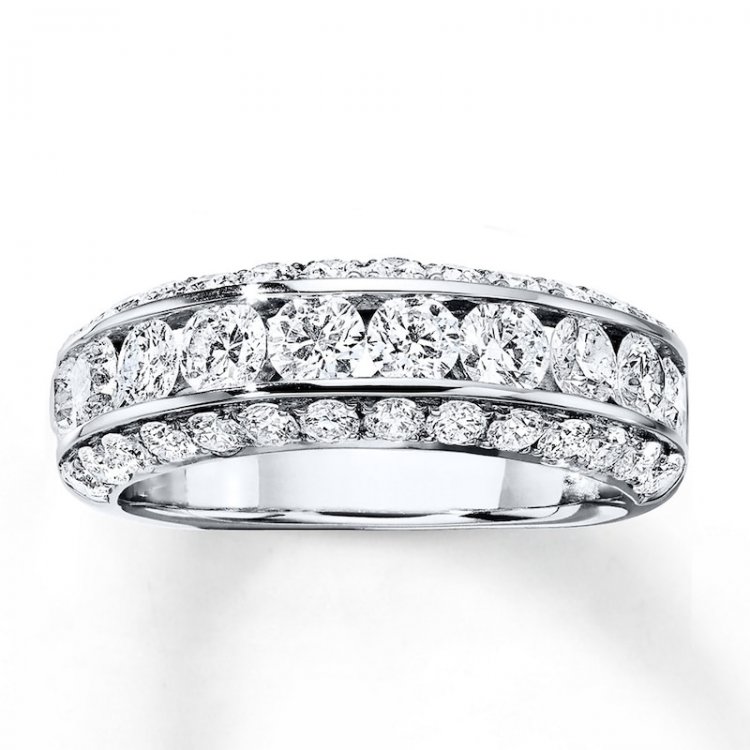 Exquisite round ideal-cut diamonds in three rows provide amazing brilliance to this anniversary band for her Independently certified by Gemological Science International, the diamonds total 2 carats in weight Crafted of 18K white gold, the band has a euro-shank for a more comfortable fit
